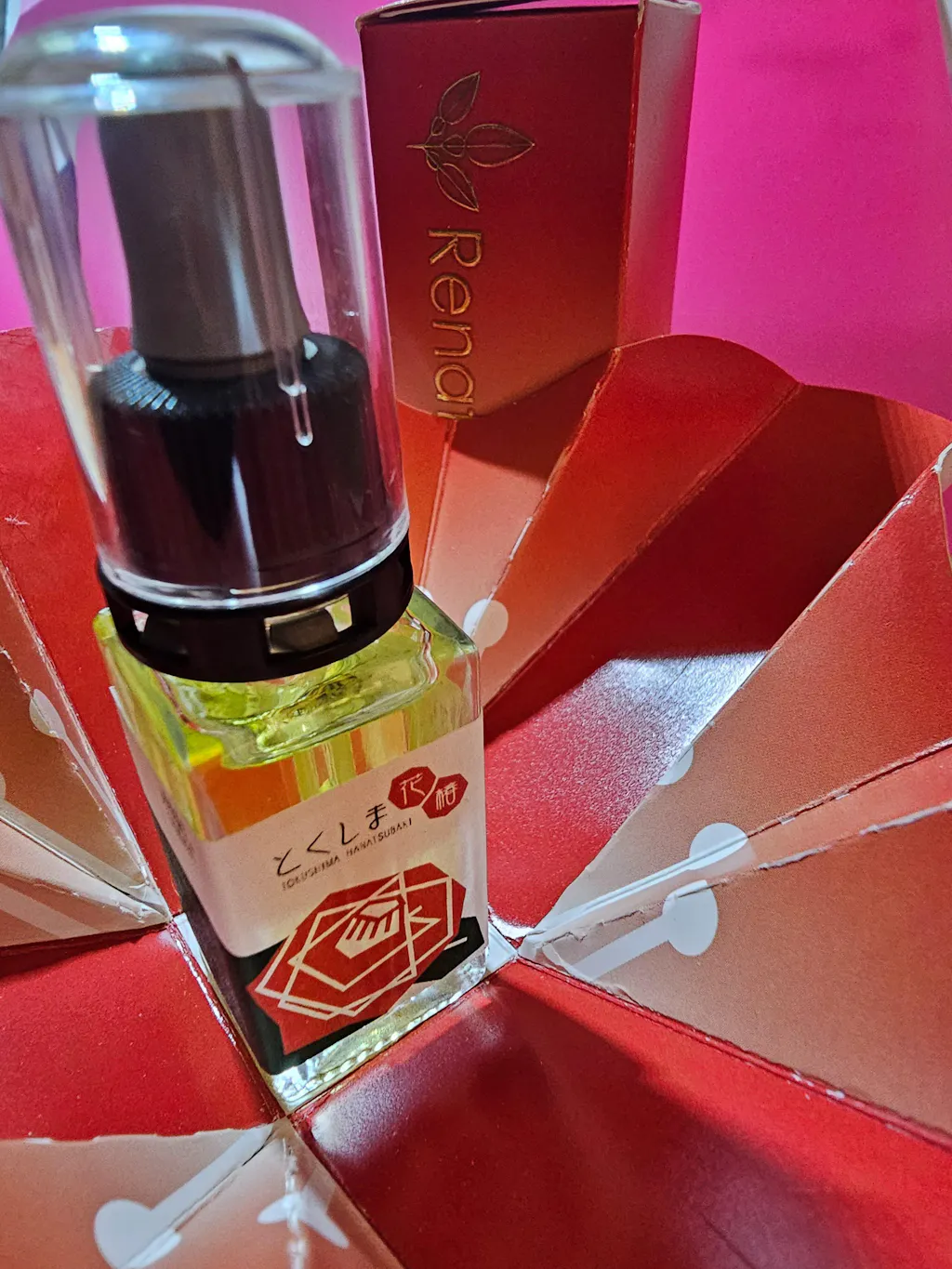 素敵なパッケージにまず感動!箱底のゴールドリボンテープ、1本スーッと入っているだけで開ける前からセンスを感じます。そして被せてある箱を開けて椿のデザインが…。手の懲りよう、この製品へのこだわりが伝わります。昔よく店頭で見かけた椿オイルとは、使用感や香りが全く違います。高級感あって、また、スポイトが付いているのでとても使いやすい。髪、肌に馴染みよくカバー力あります。貴重な10ml、大事に使います。